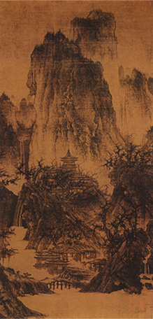 此图上半部两座高峰重叠,左右山峰低小淡远,当中一座楼阁突出,萧寺下及寺右边三四座小山冈,皆有树生其上,画的最下处是从山中流出的泉水而形成的溪水,一木桥架其上,山脚下有亭馆数间,人群来往。用笔坚实有力,画山亭馆及楼塔之类,皆仰画飞檐,勾勒而形极层迭,皴擦甚少而骨干自坚,都有李成画的特点。画原为明末清初梁清标旧藏,一时尚难确定,但属北宋李成画风无疑。